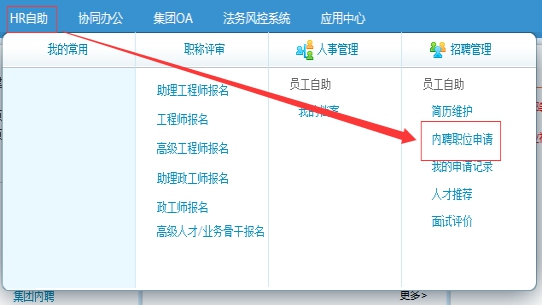 (一)福能集團(tuán)內(nèi)應(yīng)聘人員必須獲得所在單位同意,請通過個人門戶賬號登陸福能集團(tuán)企業(yè)門戶:http://10.1.12.15:83/portal,并參照下圖所示路徑進(jìn)入職位申請界面,選擇相應(yīng)的職位在線報(bào)名填寫《應(yīng)聘人員登記表》